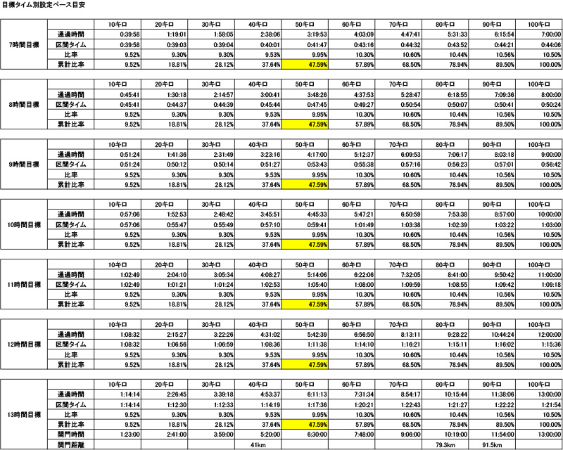 次にこの47.59%をベースに7時間から13時間のペース設定を作ってきましたのでご覧ください。