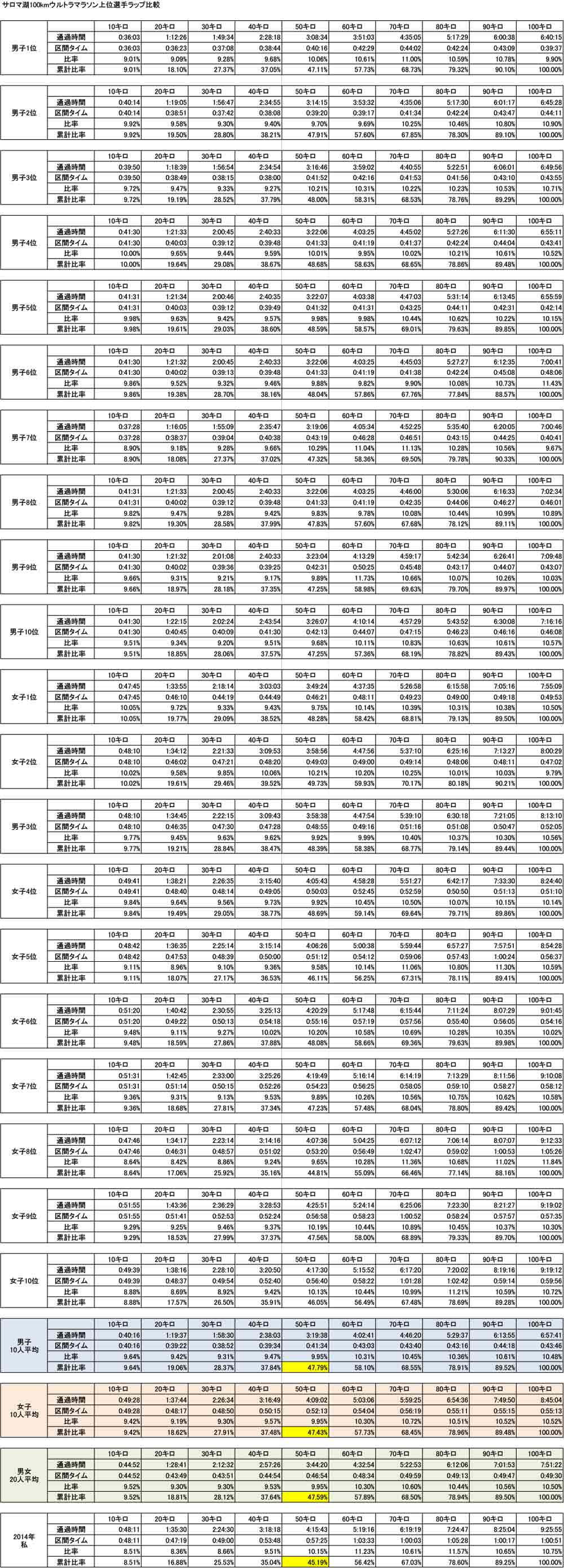まずゴールタイムにおける50km通過タイムの比率をみてください。20人の平均は47.59%です。この選手の中には6時間台も、7時間台も、8時間台も、9時間台もいるのです。もちろん中には前半速めに入って失速したランナーもいますが、それでも前半50kmの比率は44.81%で、前半抑えて後半勝負にいったランナーで49.73%というランナーもいますが多くは47〜48%に入っています。