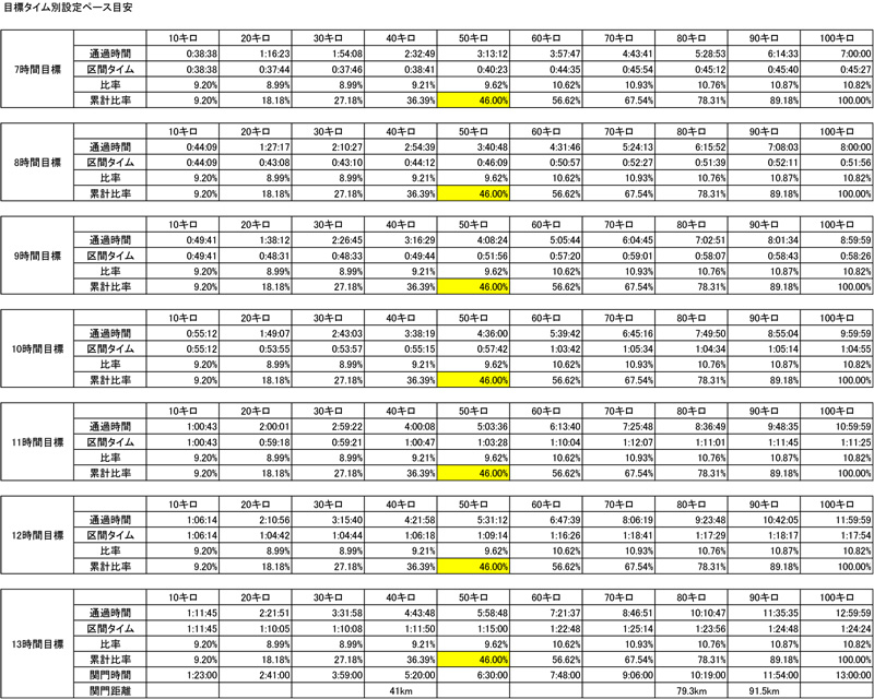 私の経験上で9時間目標と10時間目標を考えるとこの50キロ通過タイムではギリギリです。持久力の強いランナーであればいけると思いますが一般的には少し厳しいと思います。感覚的には50キロ通過を46%くらいで走れれば後半も余裕を持って走れると思います。